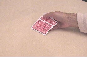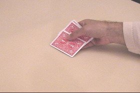 edge rests on the surface of the table while the thumb releases the card and moves to