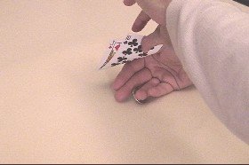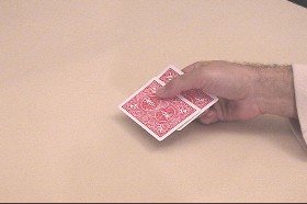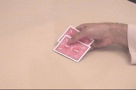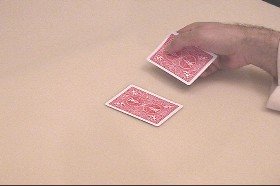 | hand.  The right hand is moved suddenly to the right allowing the top card to fall onto  |