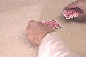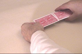 The left hand thumb and first finger grasp the top card of the packet.  The right  |