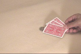 | the coin, the fan is pressed into the table.  The second card edge hits the top of the coin.  |