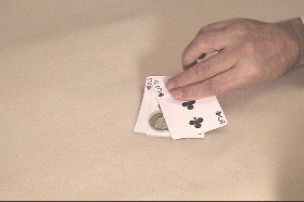 | upper right position moving over the coin.  The left finger presses against the top card  |
