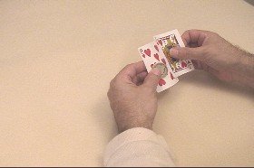 | allowing the left hand to hold both cards. This is done, apparently, to enable the right |