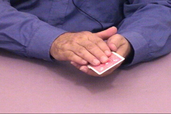 Here, we use a palmed card. In the clip shown, I palmed a card while shuffling the cards. Any way to get a palmed card is fine. I initially thought of having the card to palm in my pocket. I would put something back into my pocket to palm the card out. I did not use that method here as I did not