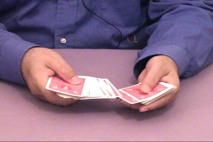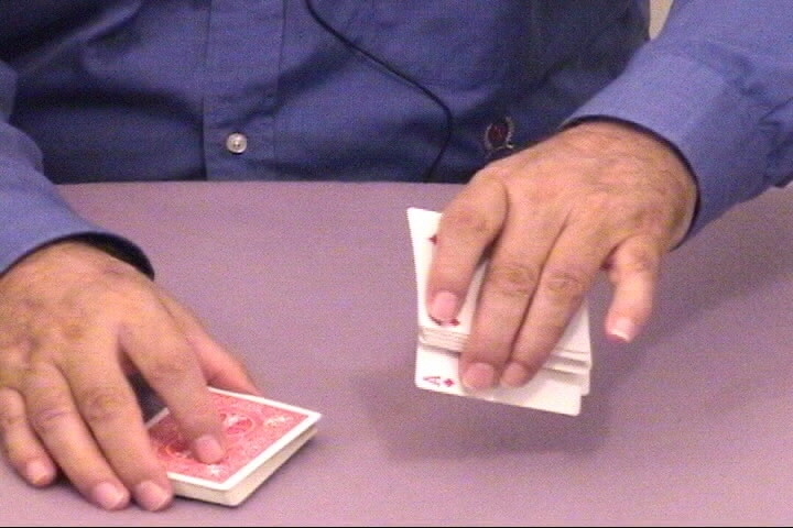 holding something so it would be logical for the top card to be shown by pushing it off and turning the deck face up.